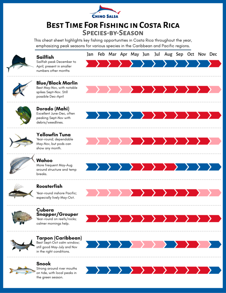 This article explores the different fishing seasons across Costa Rica, the best times and regions to book your fishing charter, what weather and species to expect, and some tips from the crew at Chino Salsa to plan your fishing trip for the most rewarding experience.